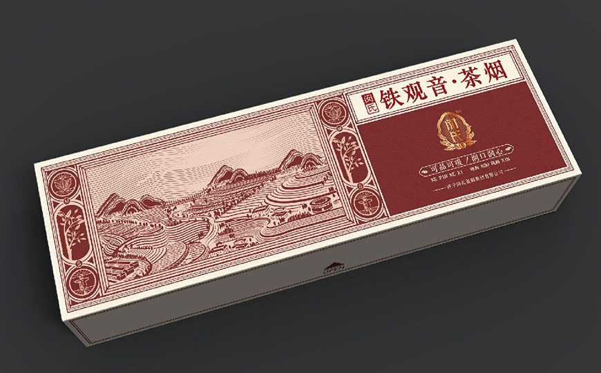 產(chǎn)品添加茶元素,在視覺(jué)設(shè)計(jì)以天然茶田為主要元素,傳達(dá)綠色生態(tài)的理念,包裝形式上采用煙包側(cè)滑盒型,在煙草品類里開(kāi)辟岀新興市場(chǎng),茶療戒煙——有效降低傳統(tǒng)卷煙對(duì)身體危害。